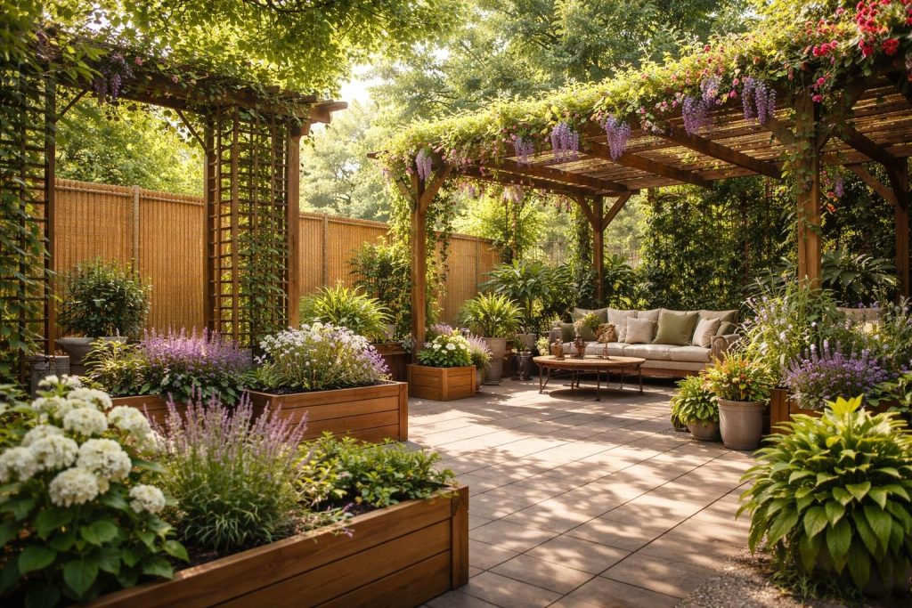 Parfois, il n’est pas nécessaire de cacher tout le jardin. Créer une zone d’intimité ciblée autour de votre terrasse ou de votre salon de jardin est souvent suffisant.